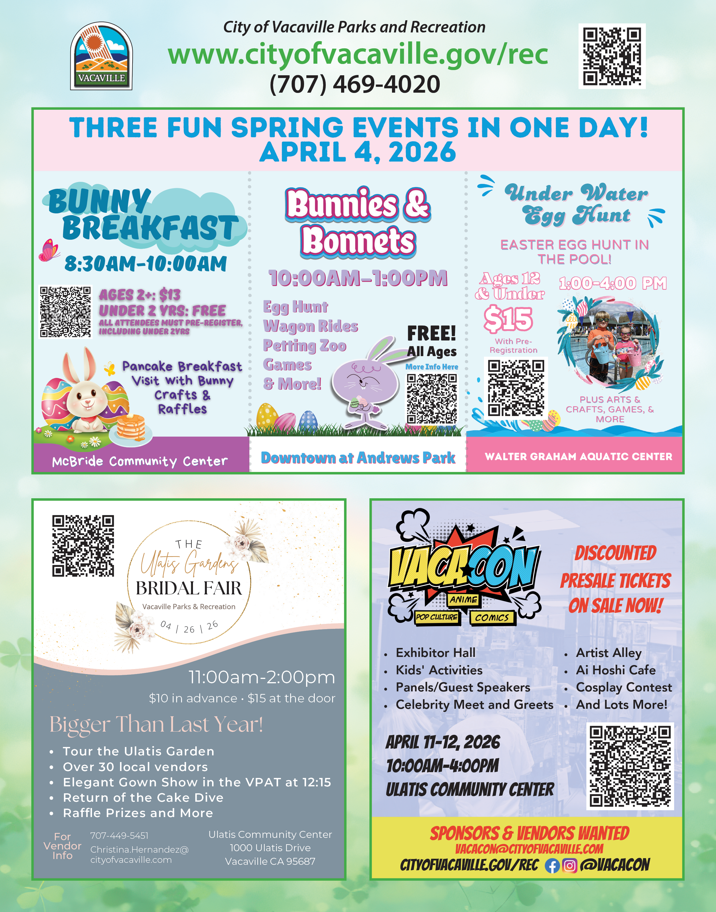 VACAVILLE – Vacaville offers a diverse selection of activities to make you and your family’s lives more active, healthy and fun. This includes the many local parks, performing arts theatre, state-of-the-art aquatic center, bike trails, and community recreational programs and events.