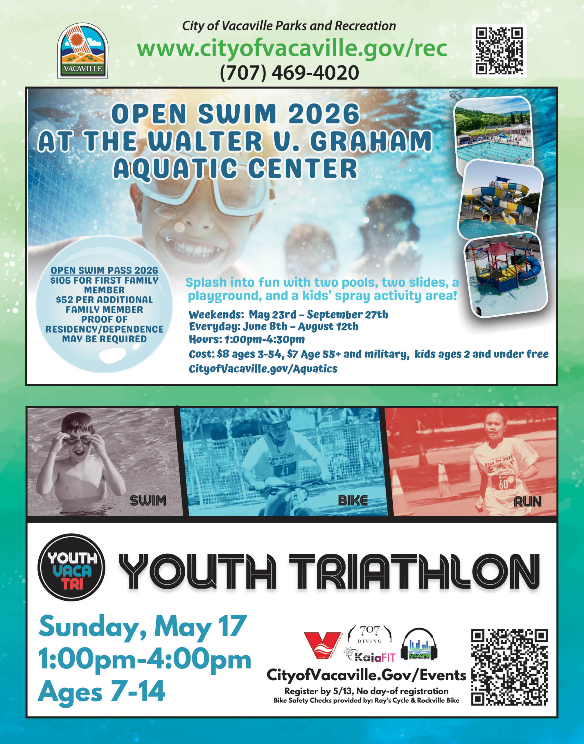 VACAVILLE – Vacaville offers a diverse selection of activities to make you and your family’s lives more active, healthy and fun. This includes the many local parks, performing arts theatre, state-of-the-art aquatic center, bike trails, and community recreational programs and events.