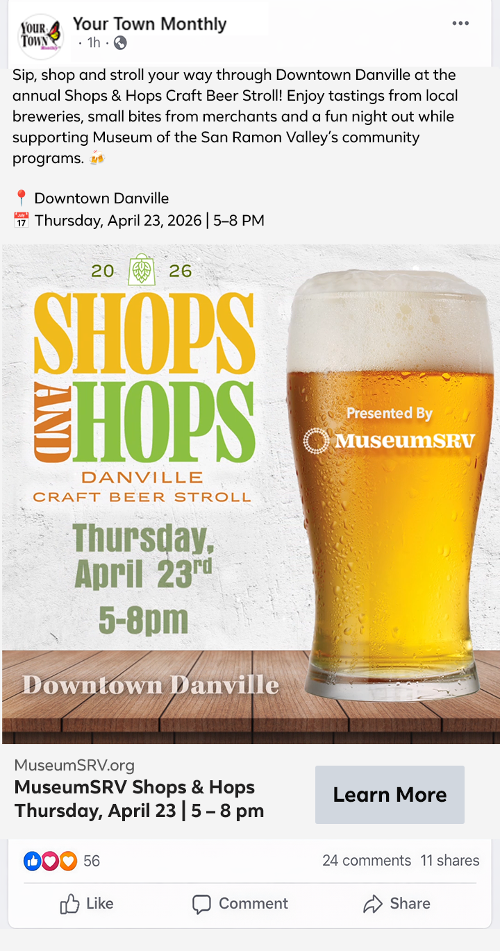 Click-through link: museumsrv.org/shops-hops Facebook post mockup: continue reading ›
