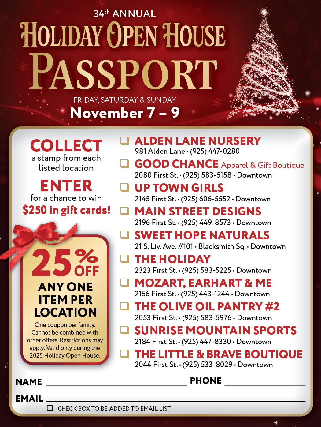 LIVERMORE – Celebrate the start of the gift-giving season with festive shopping, exclusive deals, and a chance to win $250 in gift cards. Enjoy 25% off one item from each participating retailer while discovering unique treasures perfect for everyone on your list. Click the Passport below to print.